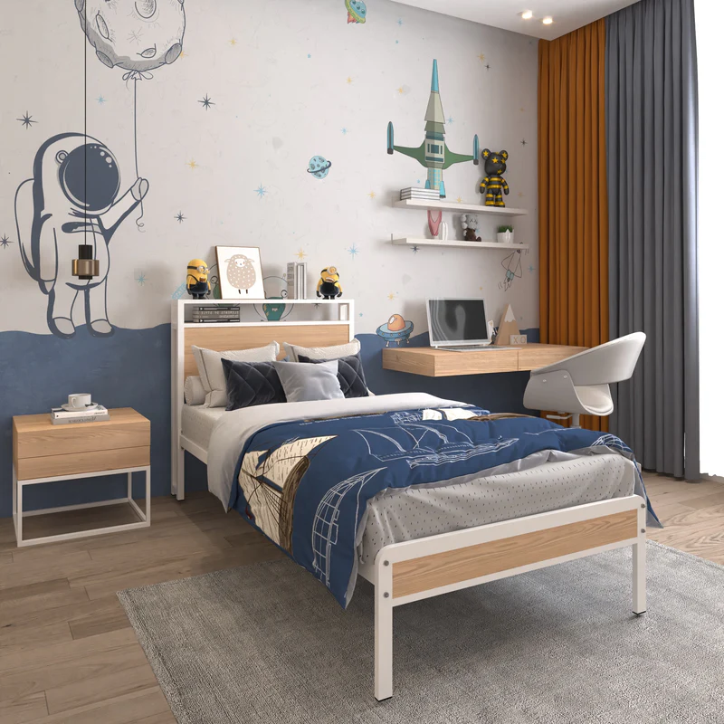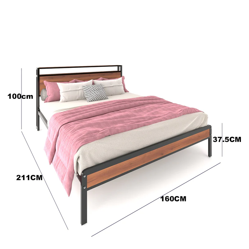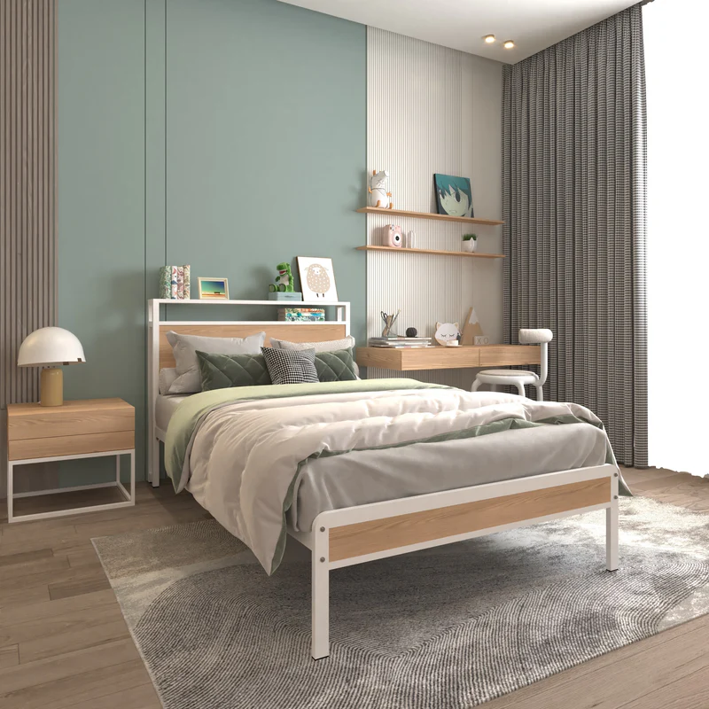 سرير إسباني بتصميم عصري يجمع بين الأناقة والمتانة، مصنوع من هيكل معدني قوي مع لمسات خشبية تضيف دفئًا ورقيًا للمكان. يوفر استقرارًا ودعمًا ممتازًا، مما يجعله خيارًا مثاليًا لغرف النوم العصرية.